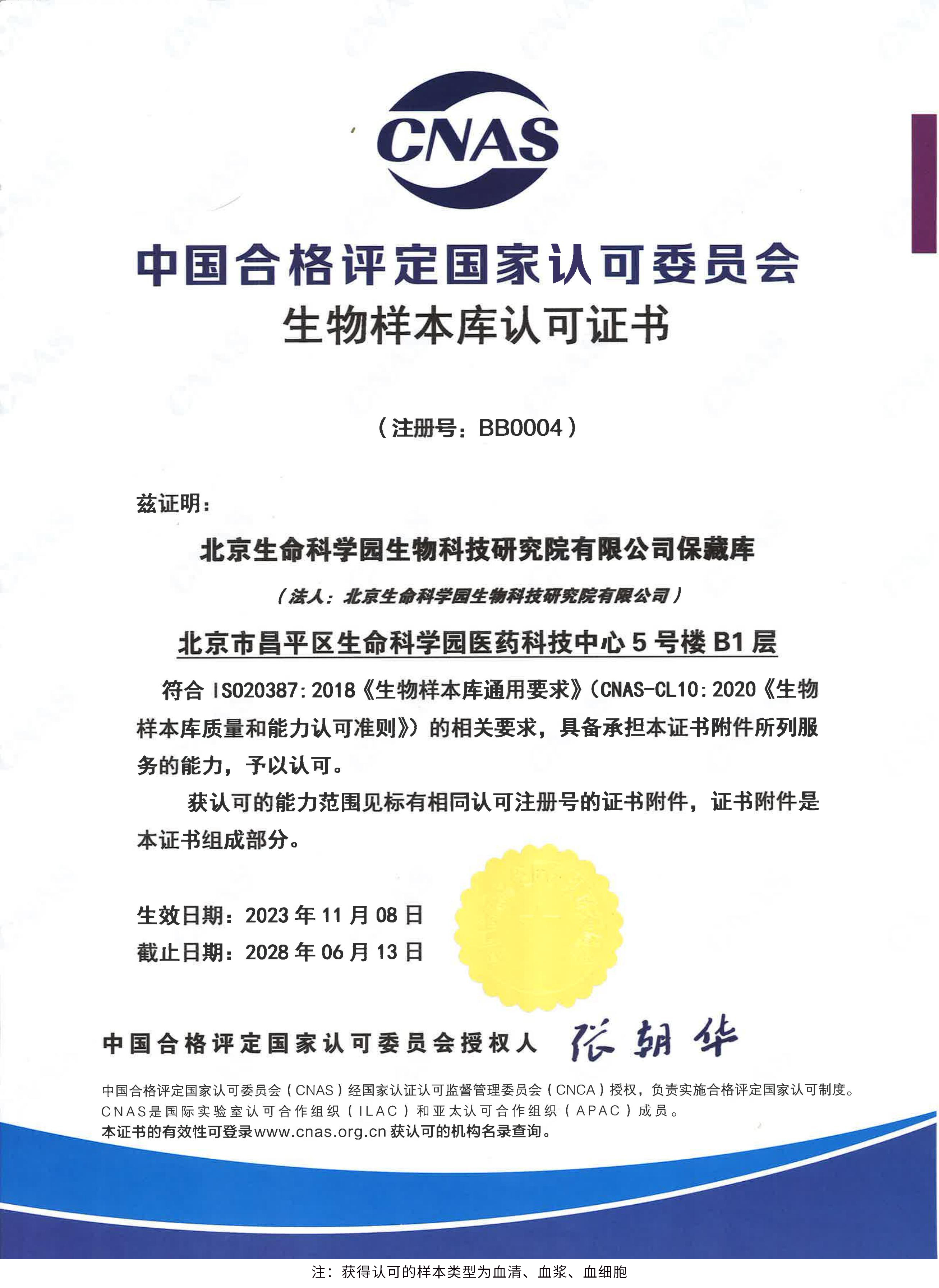 北京生命科學園生物科技研究院(以下簡稱“北京生物樣本資源庫”)(Biobank of Life Science Park,簡寫“BoLSP”)是一家由北京市科委和中關村生命科學園共同支持設立的第三方生物樣本庫公共服務平臺,秉承北京重大疾病臨床數(shù)據(jù)和樣本資源庫(以下簡稱“北京庫”)(Beijing Biobank of Clinical Resources,BBCR)十余年的發(fā)展成果,聚合眾多臨床樣本專家的專業(yè)共識,致力于在生命科學、生物醫(yī)藥研究領域發(fā)揮銜接樣本資源持有者與研究者的橋梁作用,解決生物樣本資源開發(fā)上下游信息不對稱、資源共享困難等問題。研究院在北京中關村生命科學園昌平園區(qū)建立了2000㎡生物樣本庫,最大存儲規(guī)模達1000萬份。研究院遵循CNAS-CL10:2020《生物樣本庫質(zhì)量和能力認可準則》,同時結合北京庫過去十年的工作經(jīng)驗與教訓,建立了一套完善的生物樣本保藏質(zhì)量管理體系,從人、機、料、法、環(huán)、控多個角度,實現(xiàn)生物樣本保藏過程的全面質(zhì)量控制,先后獲得國家科技部頒發(fā)的人類遺傳資源保藏行政許可證書和中國合格評定國家認可委員會(China National Accreditation Service for Conformity Assessment,CNAS)頒發(fā)的“CNAS認可證書”。